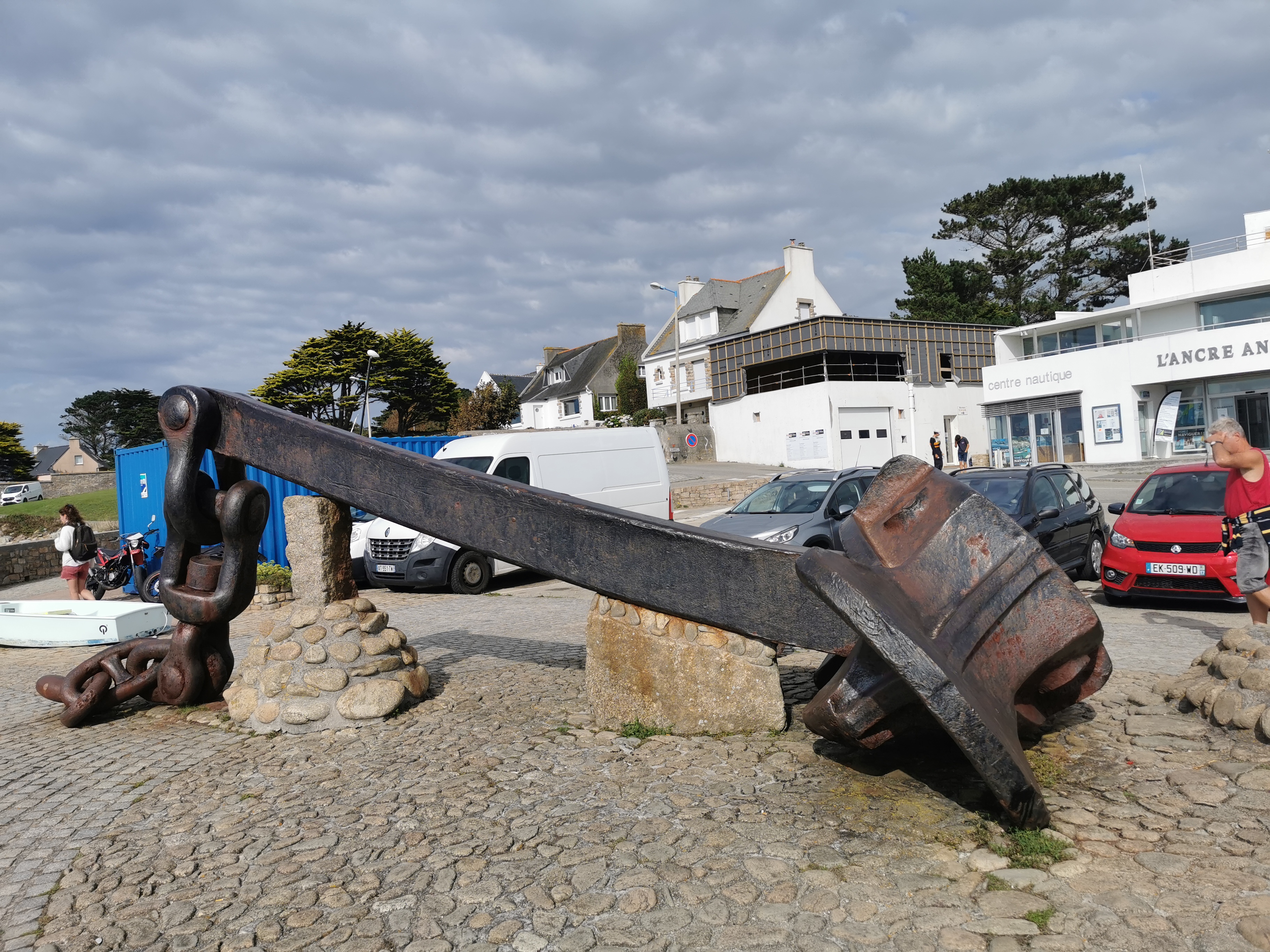 J’aurais aimé me renseigner davantage sur cette étrange ancre déposée non pas au fond de la mer, mais aux confins d’une Bretagne turbulente. Malheureusement, les portes automatiques ne voulurent pas s’ouvrir — malgré la présence à l’intérieur de deux jeunes femmes me toisant de leurs yeux globuleux, presque avec effroi. Peut-être s’étonnaient-elles de la vue d’un humain, ou plus probablement d’un touriste curieux… Peut-être même ont-elles vu sur mon visage le signe horrible d’une hérédité dégénérée, cinglante insulte à la pureté de l’espèce bretonne (ma mère vient de Loire-Atlantique !)… Cela, nous ne le saurons jamais. Reste le mystère de cette ancre échouée sur le bitume, ruine d’un monde passé encore trop présent, témoignage figé et indiscernable d’une civilisation matérielle régnant par le surplus, la contamination, la souillure de la nature.